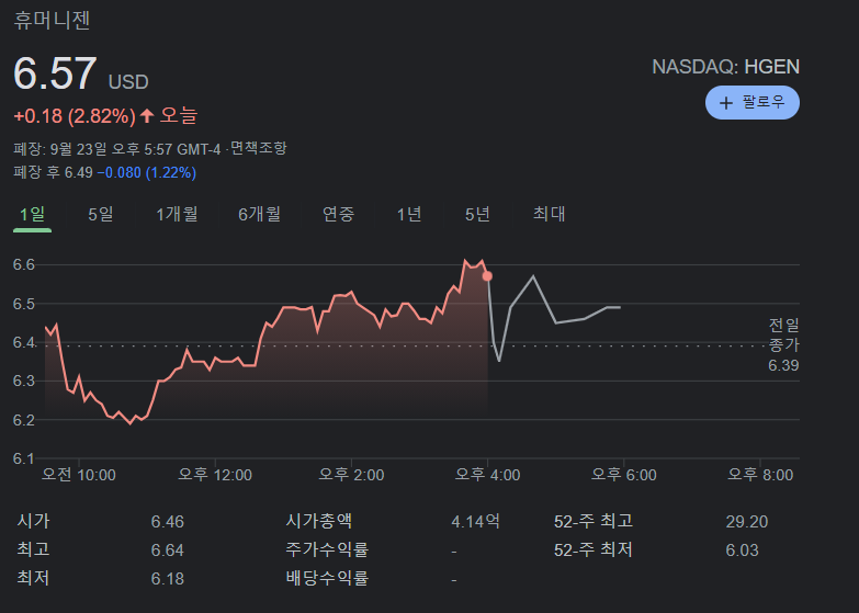 오늘 휴머니젠은 2.82% 상승한 6.57달러로 마감했습니다.
