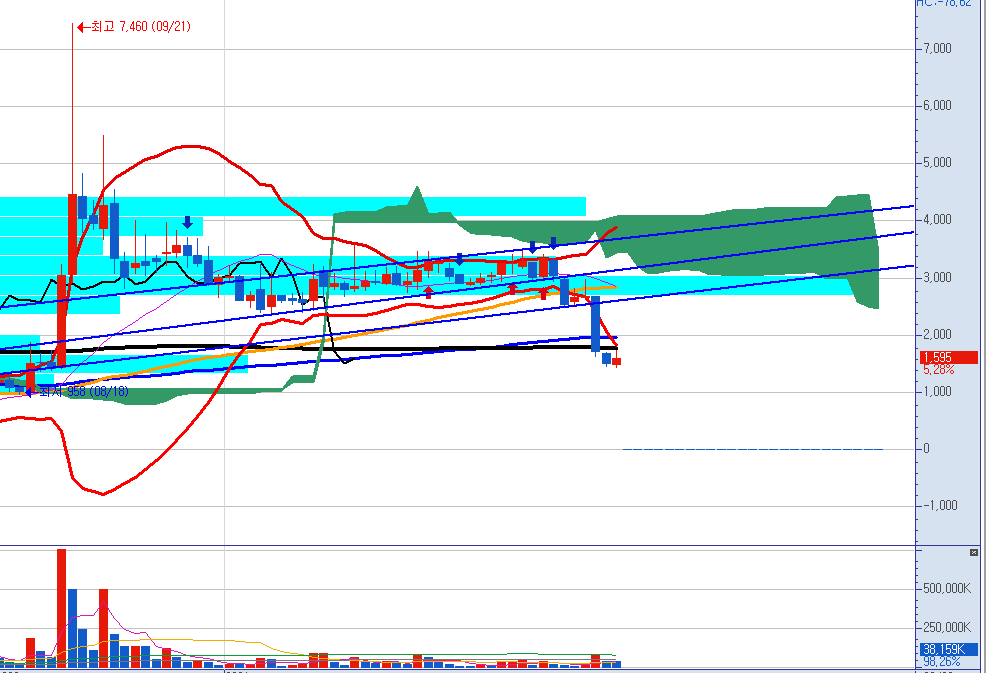 아래 일봉 챠트에서 가늘게 보이는 검은 선이 오늘만 크게 올라와 있는데요,