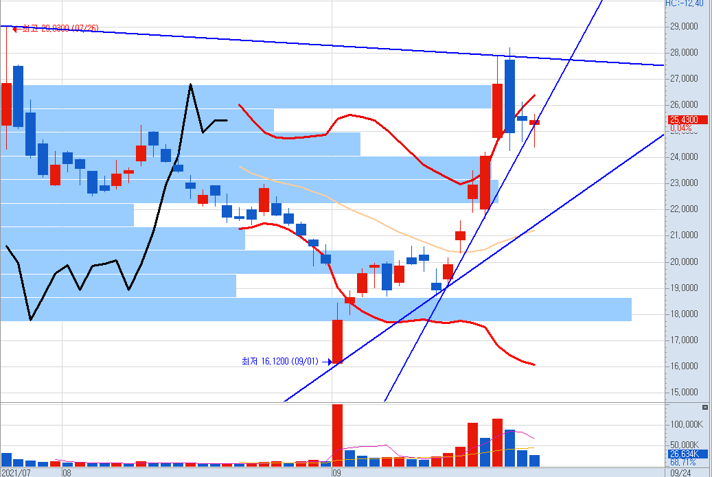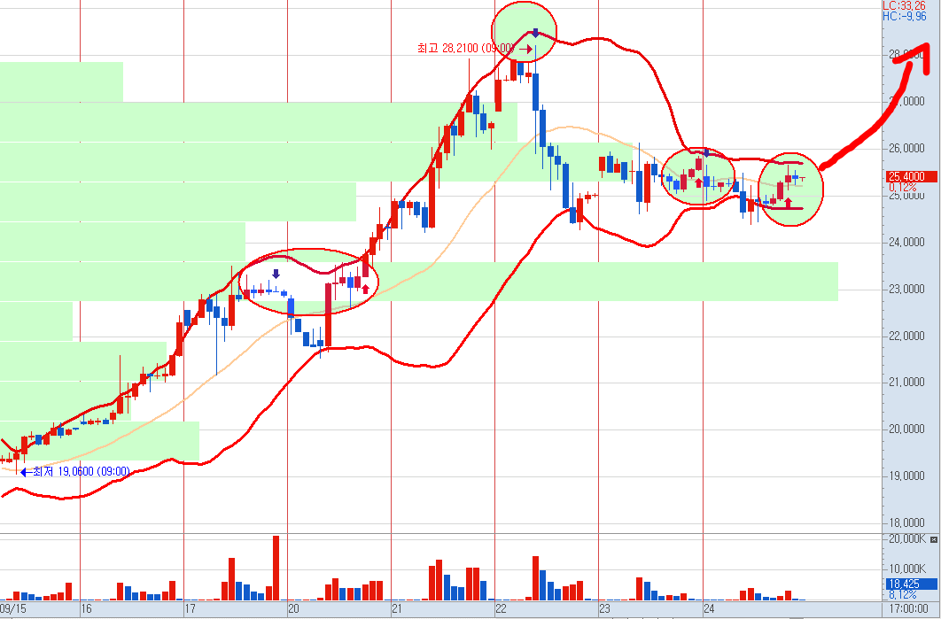 일봉을 보면 어제 그어 놓은 추세선이 보입니다.