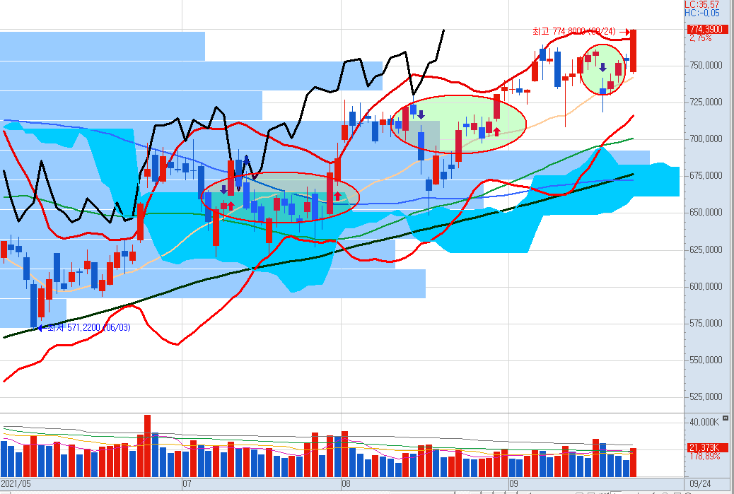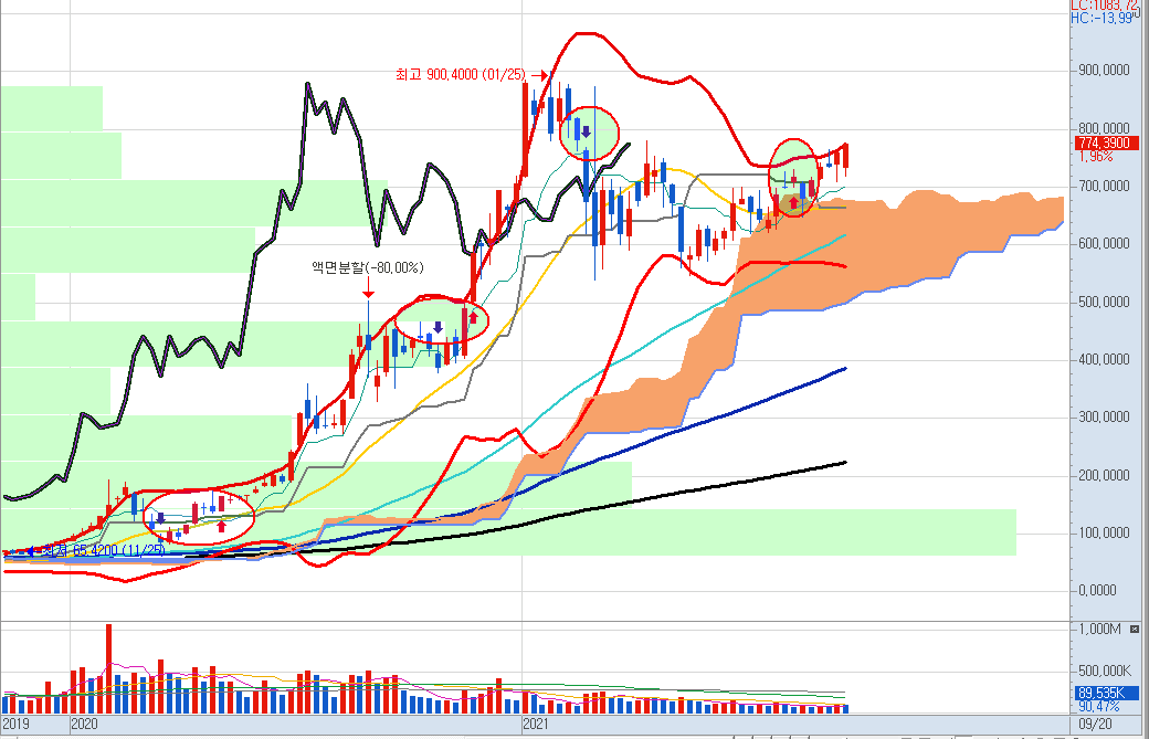 100달러 이하에 있던 주가는 지금 무려 774달러 이상 올라온 상황입니다.