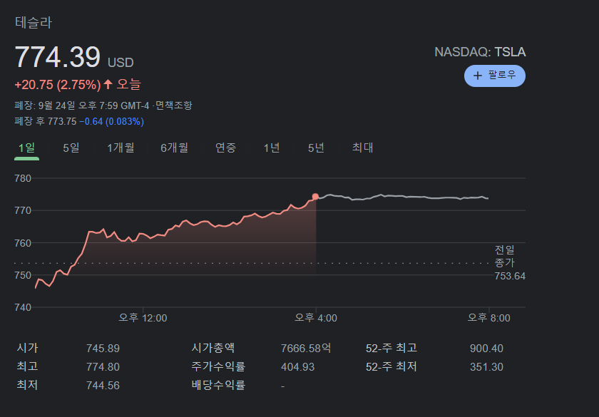 오늘 테슬라는 20.75달러 상승해서 774.39달러로 +2.75% 마감입니다.