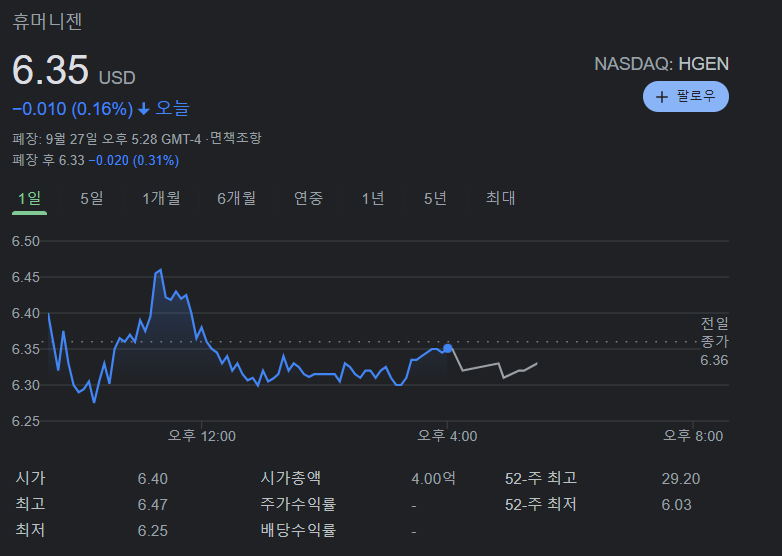 오늘 휴머니젠은 약보합으로 마감했습니다.