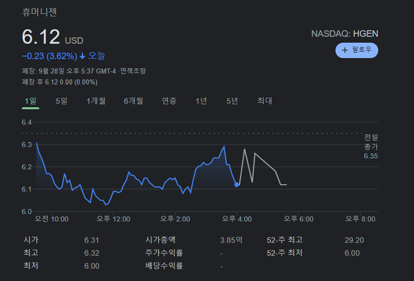 | 약보합으로 마감한 휴머니젠(HGEN) 장 마감 시황 분석 (1) | 2021.09.28 |