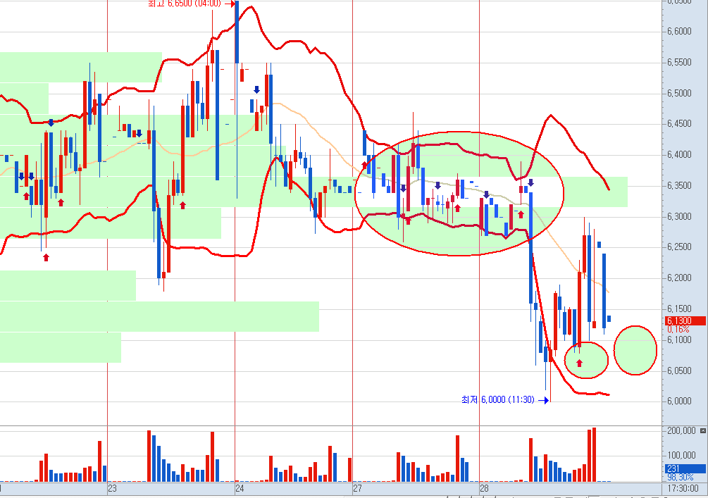 이대로 흘러가면 오늘 밤은 매도 신호가 나오면서 급락패턴으로 한 번 더 밀리게 될 것입니다.