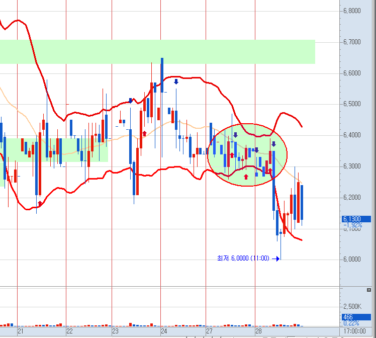 60분 봉에서 그 동안 횡보한 것이 급락으로 이어지는 분위기입니다.