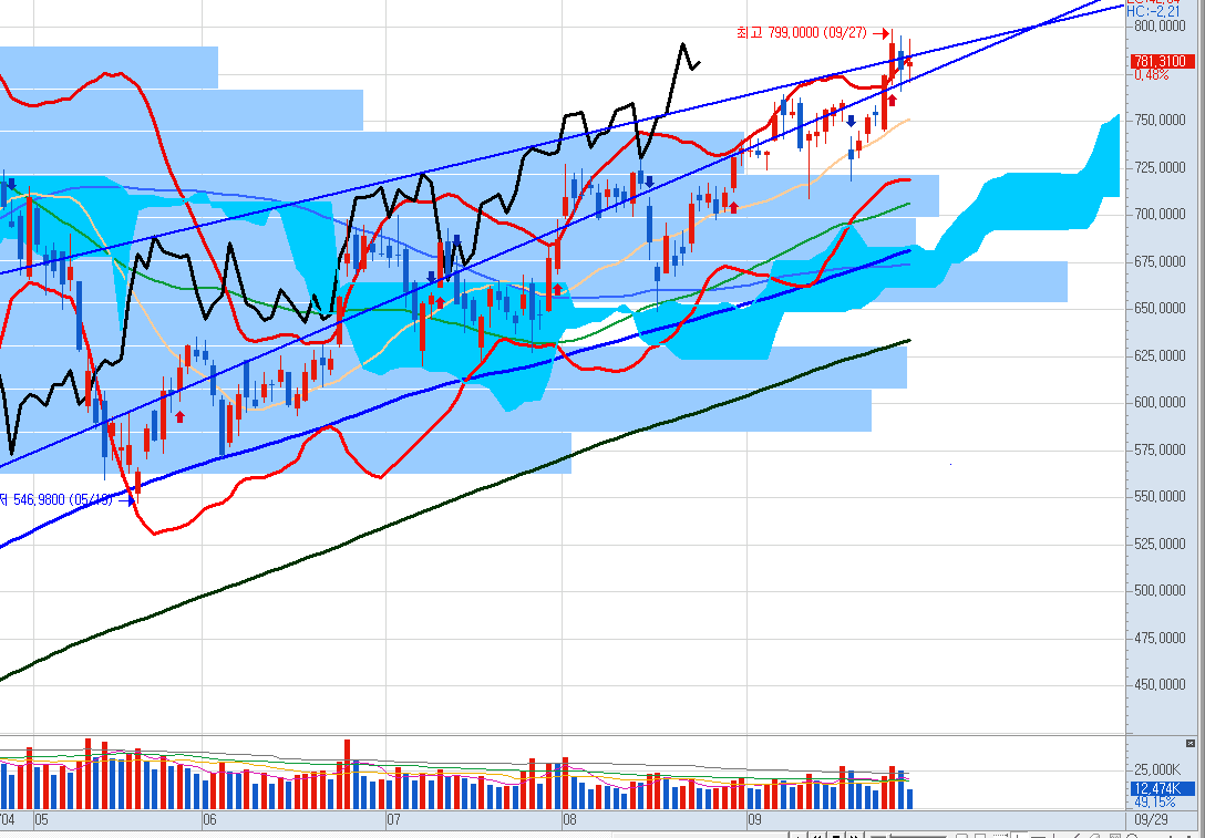 다만 볼린져밴드 상단의 저항으로 조정이 필요한 상황으로 보입니다.)
