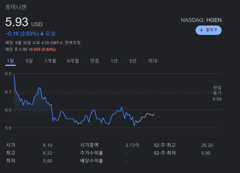 | 약보합으로 마감한 휴머니젠(HGEN) 장 마감 시황 분석 (1) | 2021.09.28 |