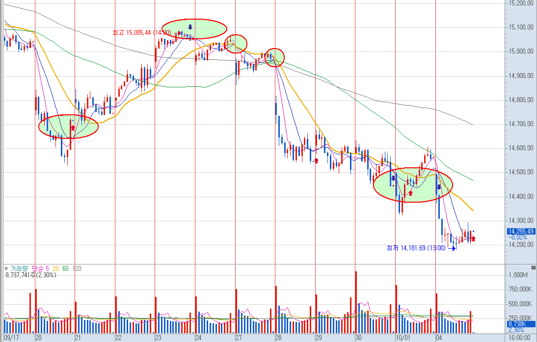 30분 봉에서 급락 패턴으로 떨어진 지수는