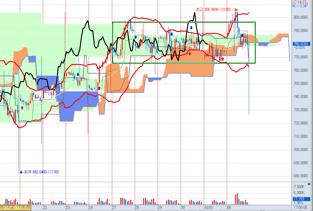 박스 안의 흐름이 급락패턴으로 진행되고 있는 것 같습니다.