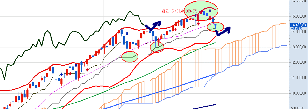 그 동안 하락할 때마다 기준선에서의 반등이 있었다는 것을 알 수 있는데요,