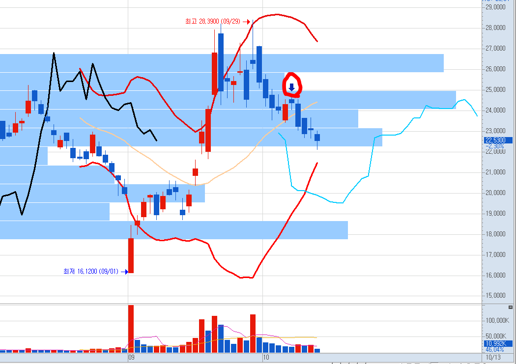 일단 일봉상의 볼밴 하단이 있는 21달러 중반 부근이 보입니다.
