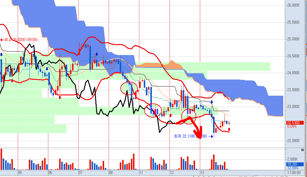 계속 후행 스팬이 골드크로스를 실패하면서 밀리고 있는데요,