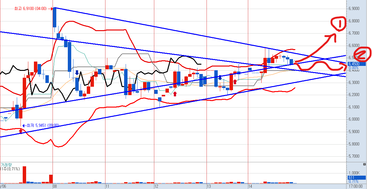 위에서 언급한 일봉으로 볼밴을 들어올릴 수 있는 상승도 기대가 되는 상황입니다.