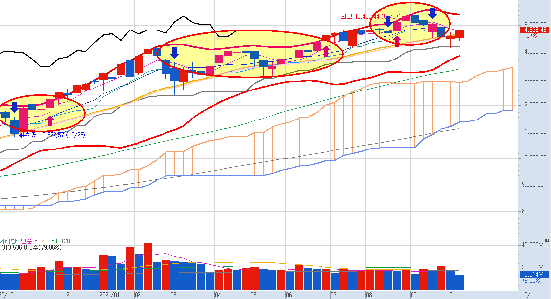 추세선을 뛰어 넘는 줄넘기 하는 듯한 움직임을 보였다.