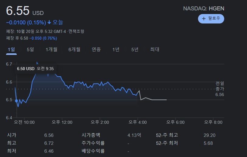 오늘 휴머니젠은 약보합으로 마감했습니다.