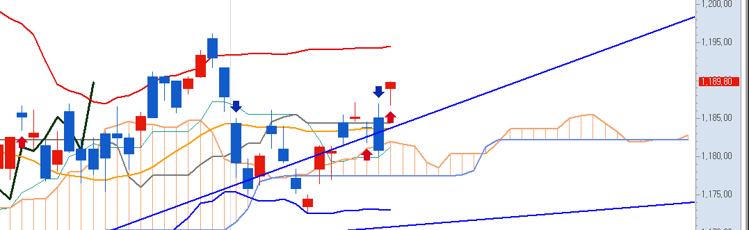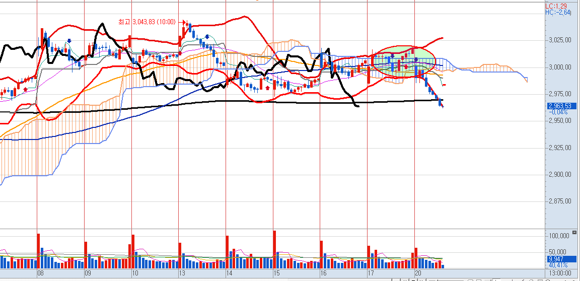 위 선물 챠트 외에 코스피 분봉 챠트에서도 오랜? 횡보를 마감하려는 듯한 급락 패턴이 진행 중인 것으로 보임