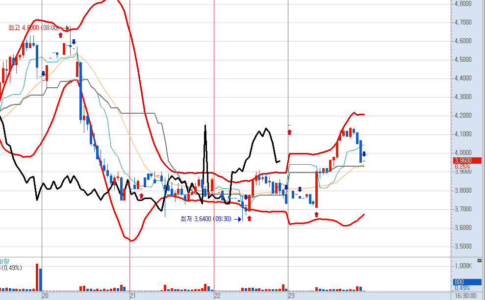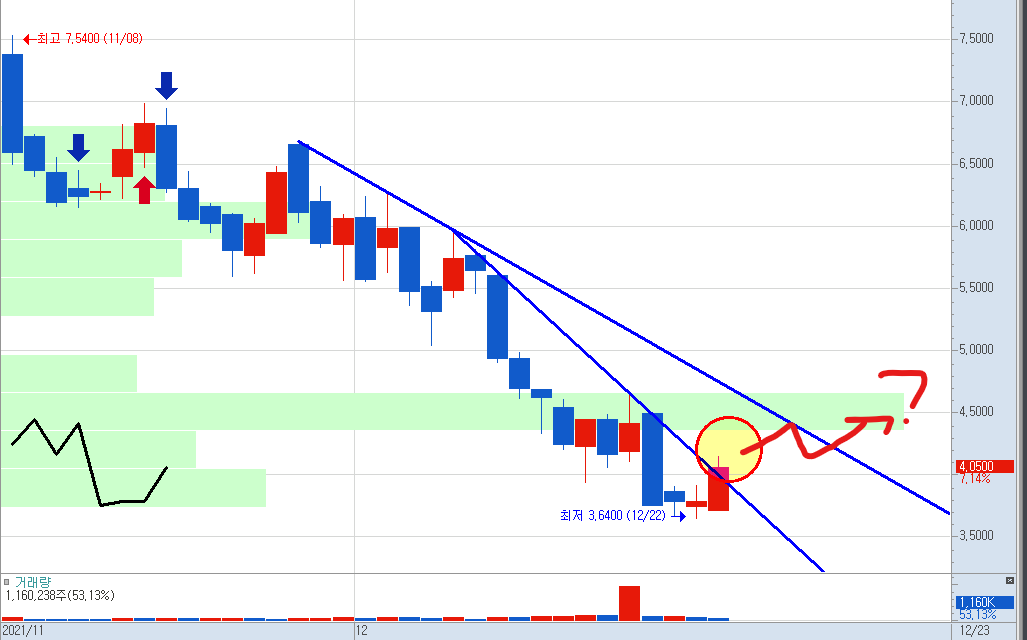 일봉을 보니 하락 추세 중 하나를 뚫고 올라온 모습인데요,