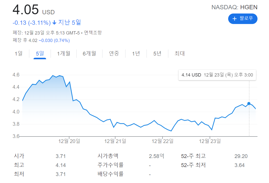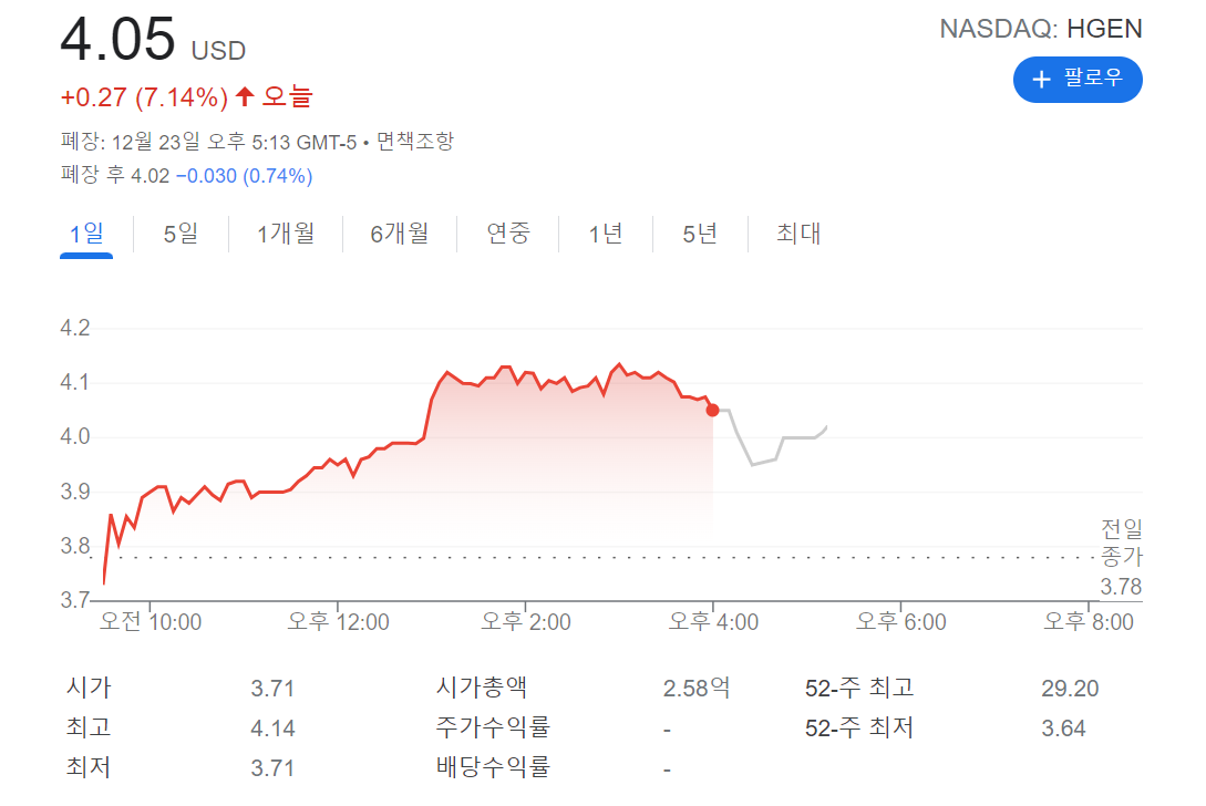 | 내일이 더 걱정되는 휴머니젠 HGEN 마감시황 (1) | 2021.12.29 |