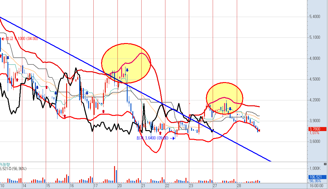 일봉으로 보면 큰 하락 추세는 물론 단기간의 하락추세에서