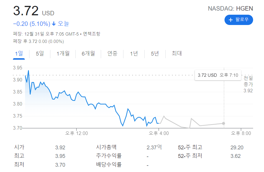 | 결국 저가 갱신한 휴머니젠 HGEN 마감시황 (0) | 2021.12.30 |