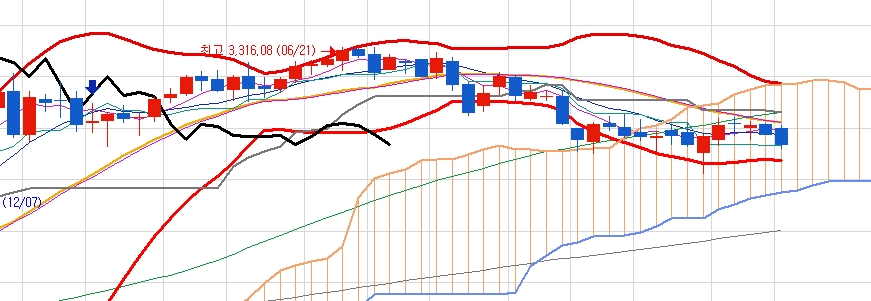 주봉에서는 매도 신호 이후 횡보로 버티는 상황이지만
