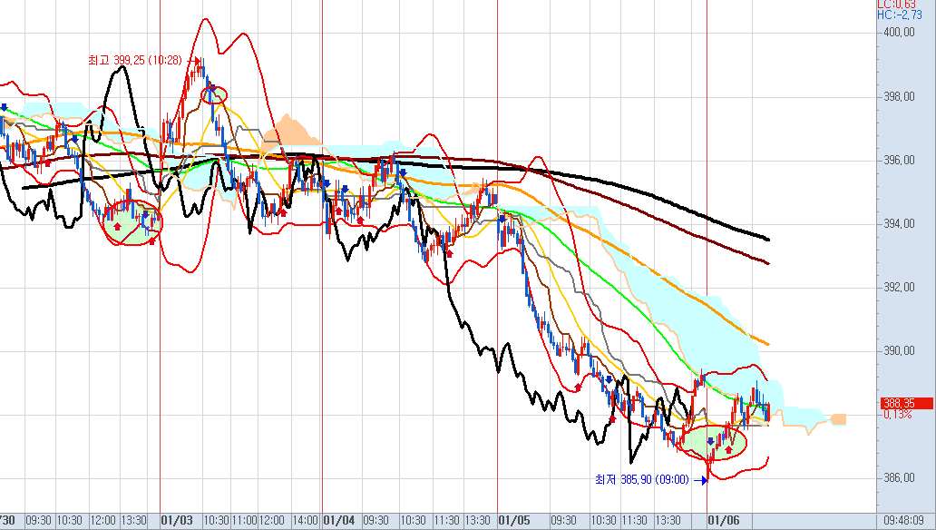 30분 봉에서는 바닥에서 매수 신호가 나오자 마자 매도 신호 진행이다.
