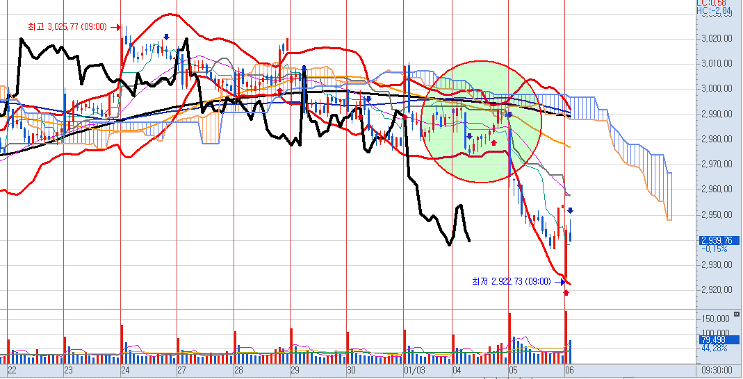 60분 봉에서는 횡보구간을 끝내는 하락이 나왔고