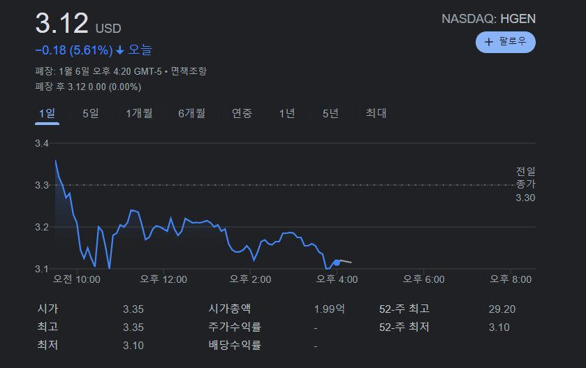 | 다시 고개 숙인 휴머니젠 HGEN 마감시황 (0) | 2022.01.05 |