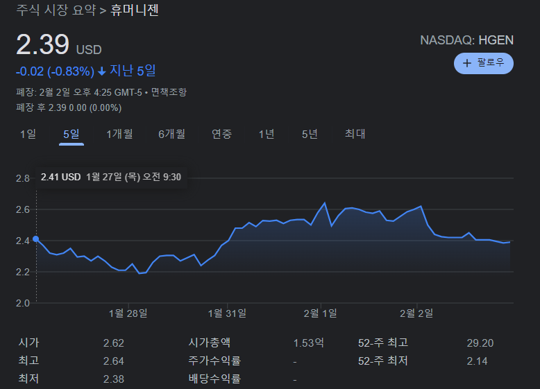휴머니젠은 8% 정도 하락하며 마감했습니다.