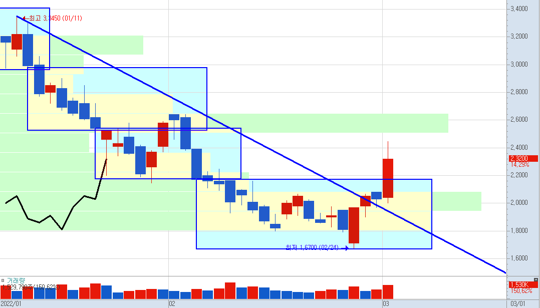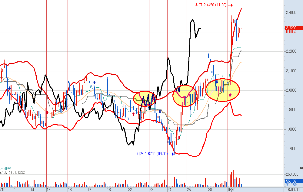 분봉을 보면 횡보 구간을 벗어나는 급등 패턴이 나왔습니다.